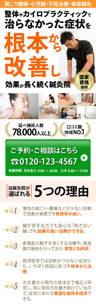キャッチコピーの文字列を大きくして、そのあとに続く女性のリラックスした表情や機密性が守られる設備などの写真でターゲット層である不妊治療や美容鍼灸を求める女性でも安心して治療を受けられるデザインにしてみました。