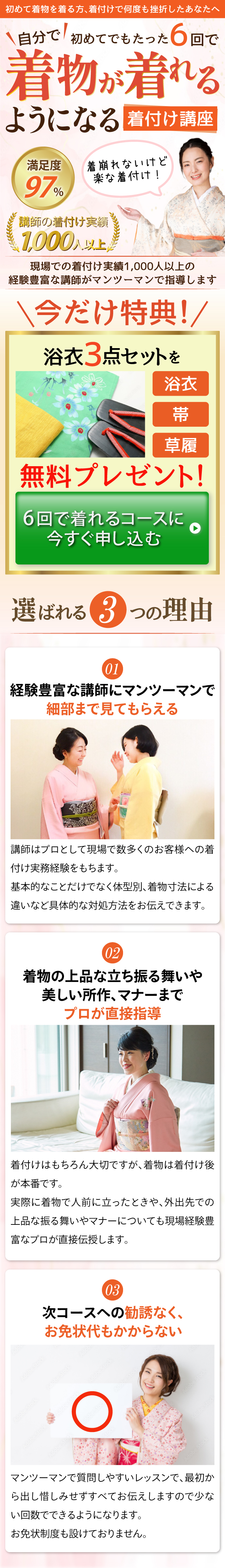 初心者でも6回で着物が着れることを訴えるために、キャッチコピーを不規則に並べて堅苦しさを取り除き、「簡単さや優しさ、楽しさ」を伝える訴求メッセージにしてみました。業界のトーンも調べ、背景色も淡いピンク色を使い、上品で優しい色遣いにしてみました。